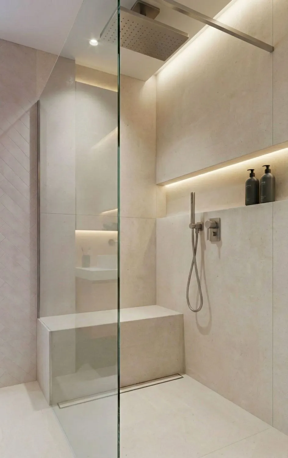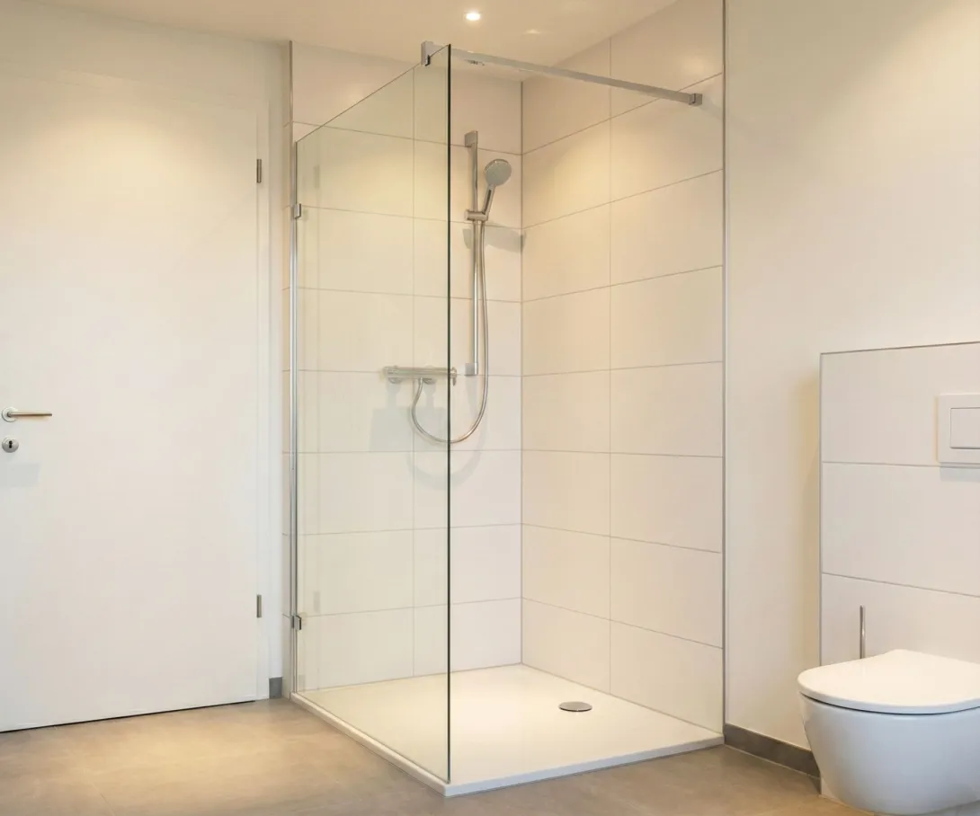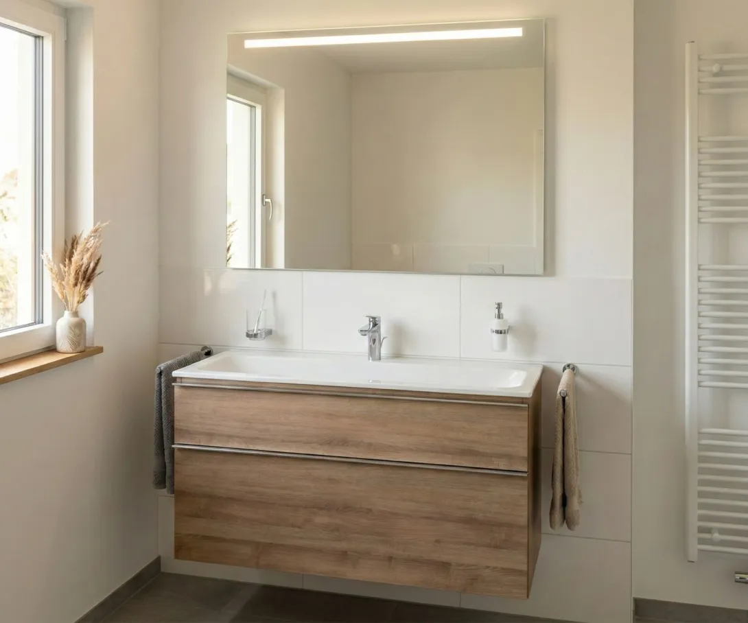 Mit einem durchdachten Konzept und einem klaren Designansatz entsteht ein schlichtes, elegantes Bad – etwa mit Glasdusche, Holzwaschtisch und großem Spiegel. Perfekt für alle, die Wert auf Funktionalität und ein modernes Erscheinungsbild legen.