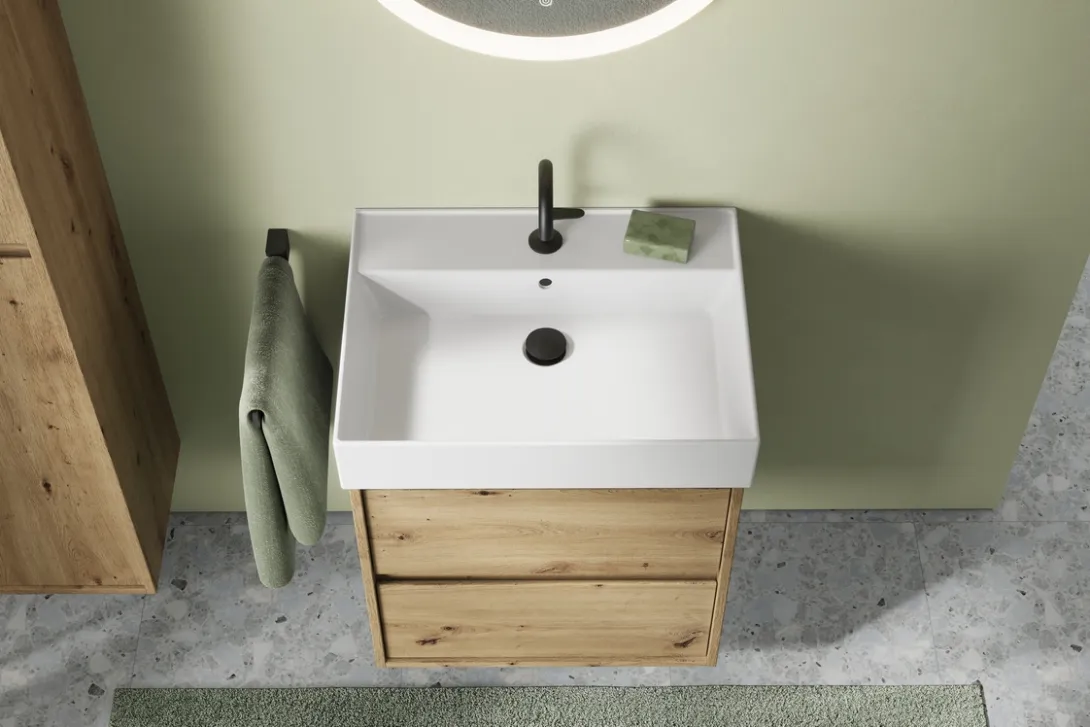 Das Ergebnis ist ein aufgeräumtes Erscheinungsbild, das sich sowohl in kleine als auch größere Bäder harmonisch einfügt.