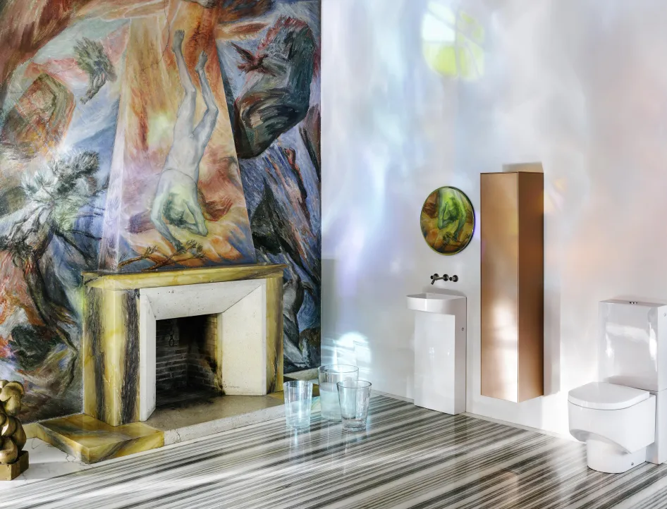Mit der Kollektion Sonar hat das Unternehmen LAUFEN die formalen Möglichkeiten der Saphirkeramik ausgelotet und den Waschtisch neu erfunden. Denn die traditionelle Badkeramik erlaubte nur ein bestimmtes Spektrum an Formen und Einsatzmöglichkeiten. Ein einzigartiges Beispiel ist ein 34 cm breiter, bodenstehender Waschtisch, der nicht nur vollkeramisch ist, sondern auf kleinster Grundfläche alle Anschlüsse abdeckt, was bei Renovierungen von Vorteil sein kann (ganz oben im Bild).